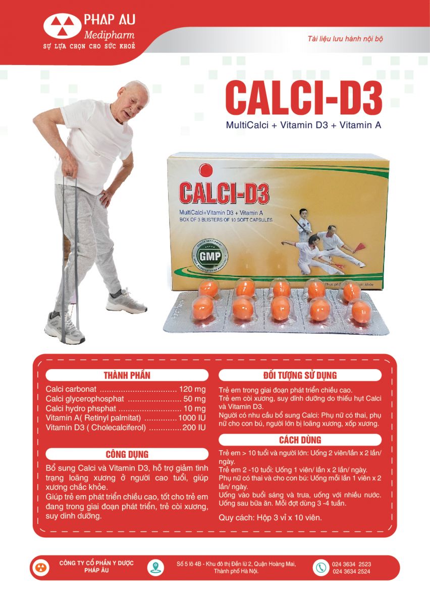 * CÔNG DỤNG: - Bổ sung Calci và Vitamin D3, hỗ trợ giảm tình trạng loãng xương ở người cao tuổi, giúp xương chắc khỏe.